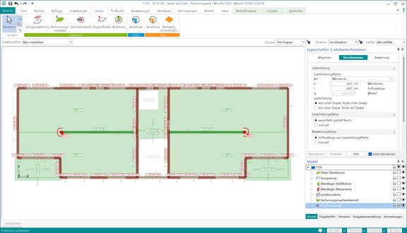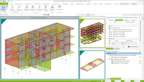 Der StrukturEditor bildet das Tragwerk als Systemlinienmodell ab und schafft damit die zentrale Basis für alle Nachweise und Berechnungen. Für den Stahlbetonbau bietet er entscheidende Vorteile: Decken, Wände und Stützen werden geschossorientiert modelliert, Lasten zentral definiert und automatisch auf die tragenden Bauteile verteilt. So lassen sich Berechnungsmodelle für eine Vielzahl von Stahlbetonbauteilen in der BauStatik oder komplexer Teil-Systeme in MicroFe direkt aus dem Strukturmodell ableiten.