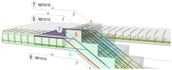 Die Wahl der Bewehrung wird über das Kapitel „Bewehrung“, in den Eigenschaften der Positionen, detailliert gesteuert. Die Überführung der statisch erforderlichen As-Werte in eine konkrete Bewehrungsführung erfolgt somit automatischen in dem durch den Tragwerksplaner gesteckten Rahmen. Die einzelnen Positionen der Bewehrungsführung je Bauteil und je Detailpunkt werden zusätzlich zur zeichnerischen und tabellarischen Dokumentation der Ausgabe, auch als 3D-Bewehrungsobjekte vorbereitet. Diese 3D-Objekte können im Anschluss an die Bemessung, in eine virtuelles Gebäudemodell in ViCADo überführt, und mit weiteren Bewehrungsinformationen ergänzt werden.