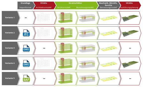 Die Varianten 1, 3 und 4 zeigen klassische, „closed BIM“ Arbeitsvarianten, die ohne Modellaustausch auf Basis eines virtuellen Gebäudemodells in der Tragwerksplanung arbeiten. Die Varianten 2 und 5 zeigen Möglichkeiten der „open BIM“ Projektbearbeitung, da hier der Modellaustausch die Grundlage für die Fachplanung liefert. Dabei ist zu beachten, dass die Variante 2 mit IFC-Austausch den maximalen Bearbeitungsvorteil zur Verfügung stellt.