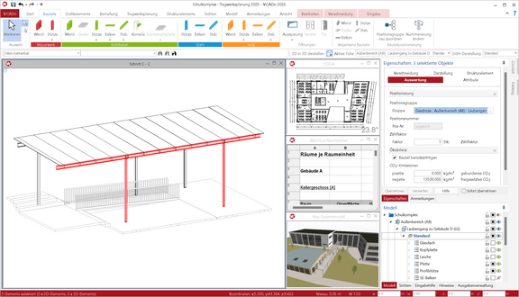 Zum Grundumfang gehört auch das Strukturmodell, das entweder frei erstellt oder direkt aus dem Architekturmodell abgeleitet werden kann. Funktionen wie das automatische Ausrichten und Umbenennen von Strukturelementen sorgen für konsistente Modelle und sparen wertvolle Zeit. Aus dem 3D-Modell lassen sich gezielt 2D-Sichten wie Schnitte oder Draufsichten erzeugen. Diese können mit Maßketten und weiteren Zeichnungselementen ergänzt werden, sodass vollständige und übersichtliche Pläne entstehen. Die gesamte Vorgehensweise ist transparent und unterstützt eine effiziente Arbeitsweise.