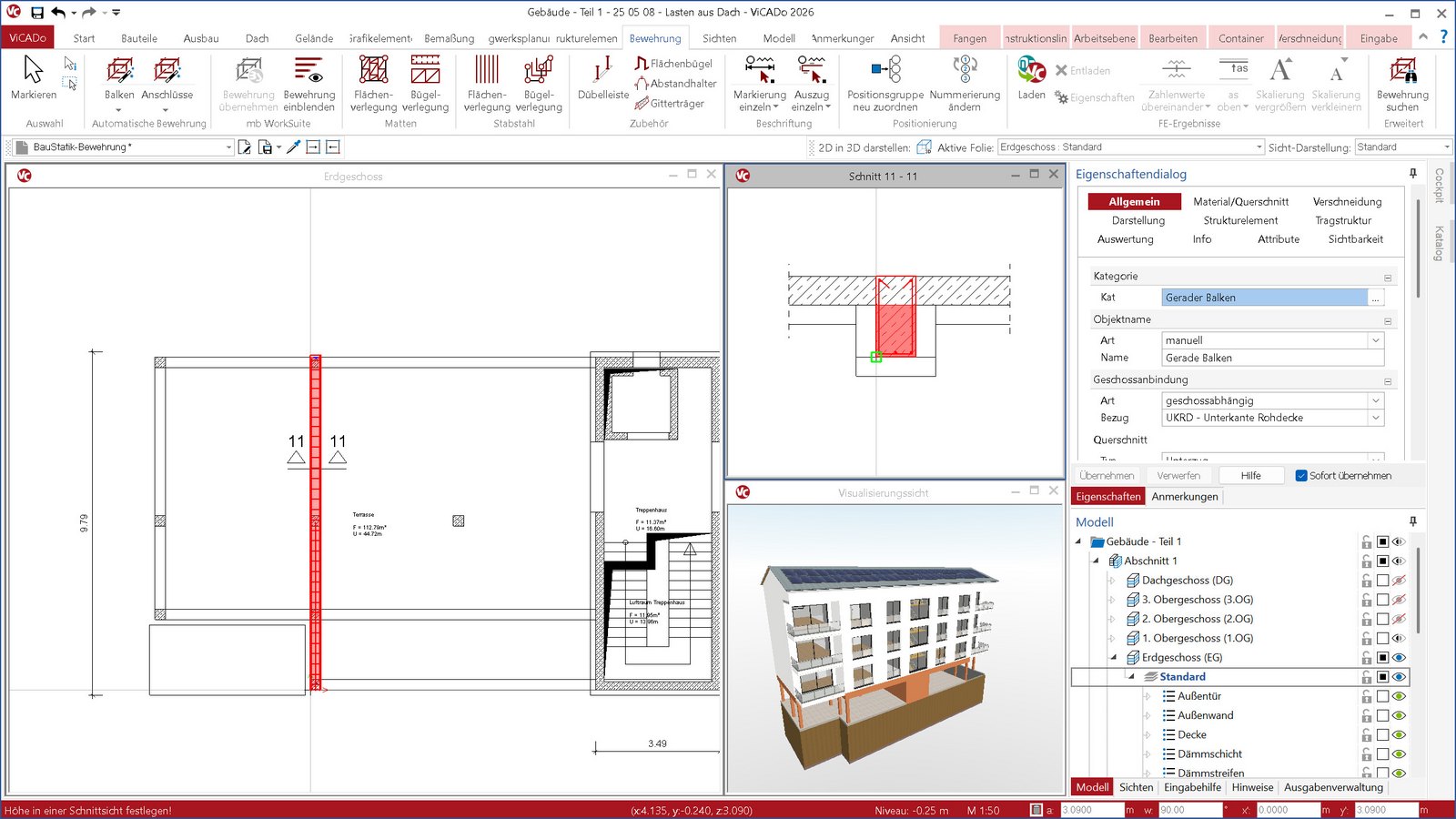 Die neuen Funktionen zur konstruktiven Bewehrung für Träger, Stützen und Wände verbessern die Nachvollziehbarkeit in der BauStatik durch eine klare Trennung von statischer und konstruktiver Bewehrung. Die vollständige und automatische Übergabe der kompletten Bewehrung von der BauStatik zu ViCADo ermöglicht eine durchgängige Planung und zielt somit voll auf den mb WorkSuite Gedanken mit durchgängigen, anwendungsübergreifenden Workflows ab