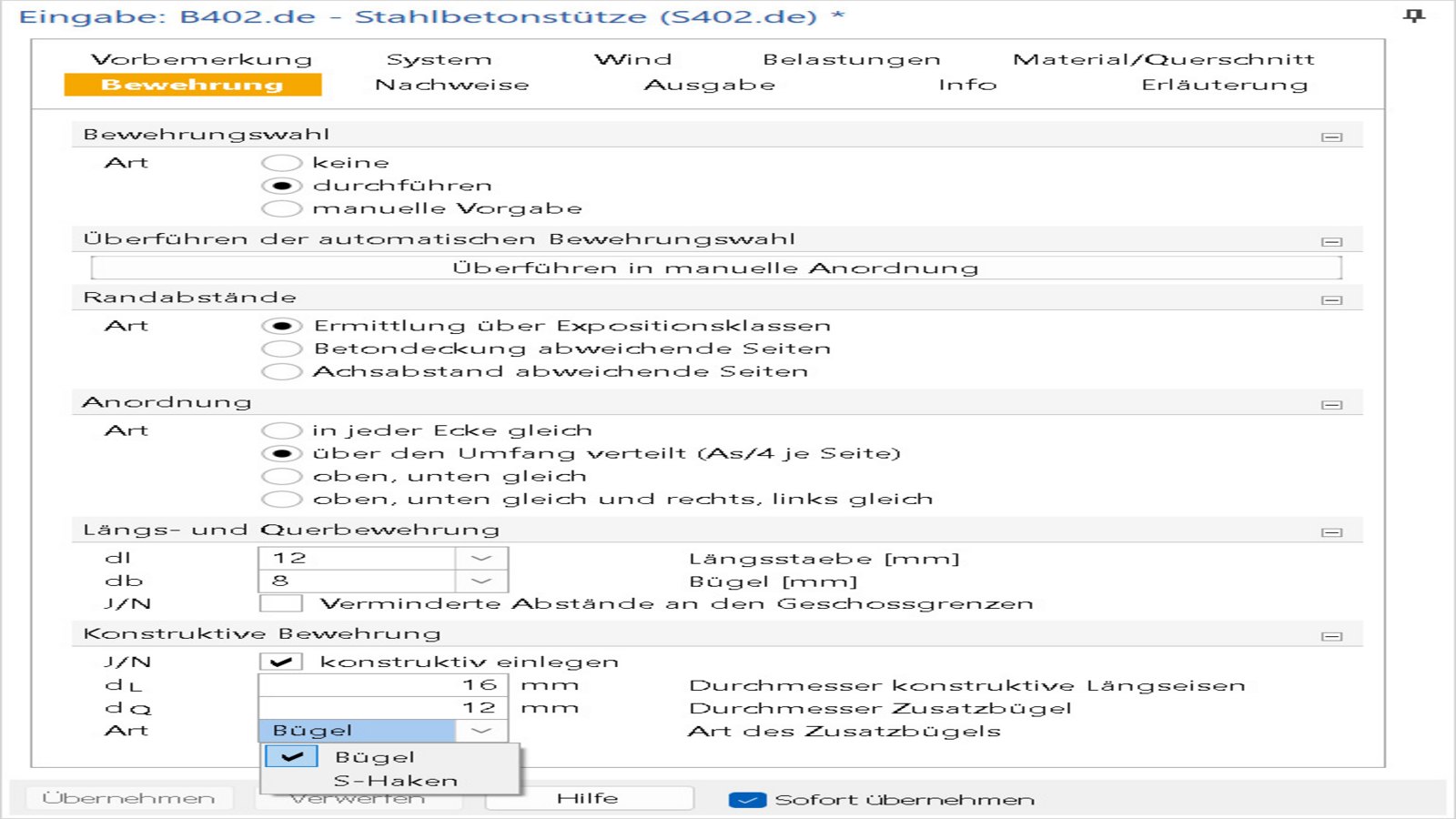 Bei der Eingabe wird in der Funktionalität zwischen der Bewehrungswahl „manuell“ und „automatisch“ unterschieden. Für die automatischen Bewehrungswahl wird die Form des Bügels automatisch wie erforderlich gewählt. Weiterhin wird die Querbewehrung um die S-Haken erweitert und die Bügelbewehrung optimiert. Steckbügel können in der manuellen Bewehrungswahl je Seite gesteuert werden.