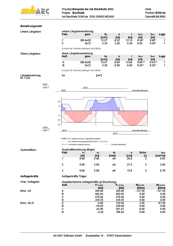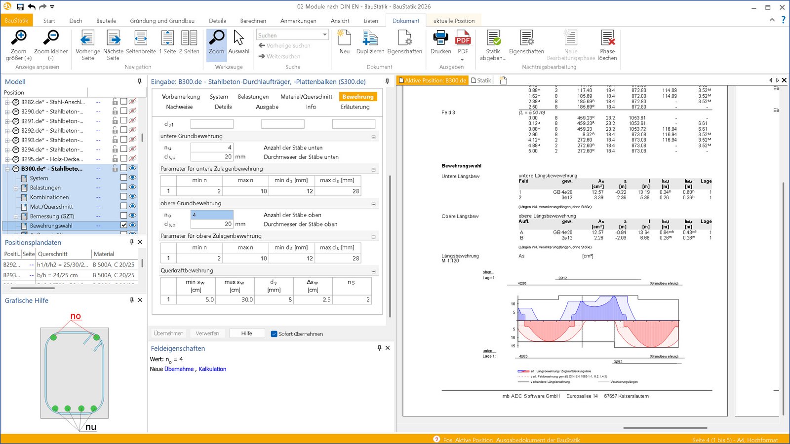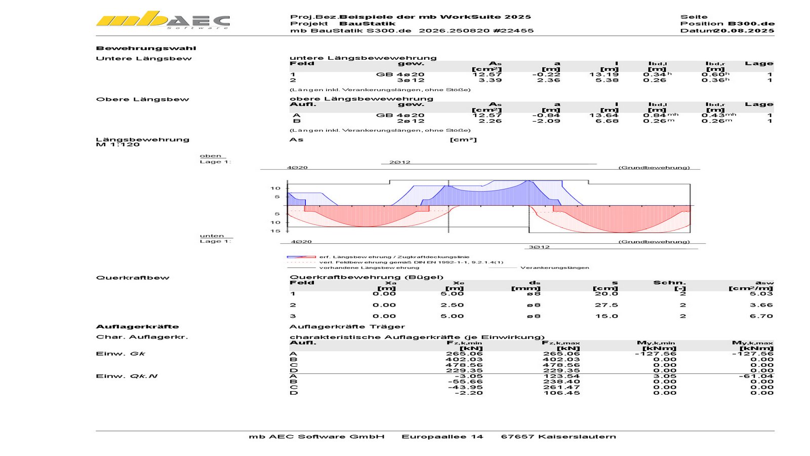 Mit der aktuellen mb WorkSuite 2026 wurde dieser Funktionsumfang deutlich erweitert. In vielen Modulen der BauStatik besteht nun die Möglichkeit, zusätzlich konstruktive Bewehrung zu definieren. Diese Eingaben ermöglichen es, konstruktive Anforderungen wie z. B. Montagehilfen für zusätzliche Lagen direkt in der BauStatik zu erfassen. Konstruktive Bewehrung ist statisch nicht erforderlich. Die Angaben werden ab jetzt in der Ausgabe dokumentiert und können vollständig an ViCADo übergeben werden.